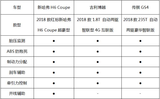 论配置,新哈弗H6 Coupe、吉利博越、传祺GS4三者主动安全配置相当,均配备了ABS防抱死、制动力分配、刹车辅助、牵引力控制、胎压监测等丰富主动安全配置,让驾乘者一路安然无忧。全景天窗,这款为驾乘者提供开阔视觉感受的配置,是新哈弗H6 Coupe优于传祺GS4之处,对年轻消费者来说,更是浪漫又实用的配置。诸如腰部支撑调节等人性化配置方面,传祺GS4略失诚意,而新哈弗H6 Coupe这一点考虑得就较为周到,驾乘体验分分钟完胜。