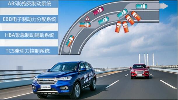在具体功能上,ABS防抱死会在紧急制动时以每秒几千次的频率对车辆进行“点刹”,避免在制动时车轮因抱死而失去转向能力和稳定性;EBD是ABS的附加功能,通过监测四轮状况,分配制动力,平衡轮胎有效地面附着力,防止出现甩尾和侧滑;HBA紧急制动辅助会监控驾驶员踩刹车踏板的频率和力量,在紧急时刻提供辅助刹车制动力,缩短刹车距离,确保车辆安全;TCS牵引力控制通过车身传感器监测车辆行驶状态,通过控制点火时间、供油系统调整动力输出。