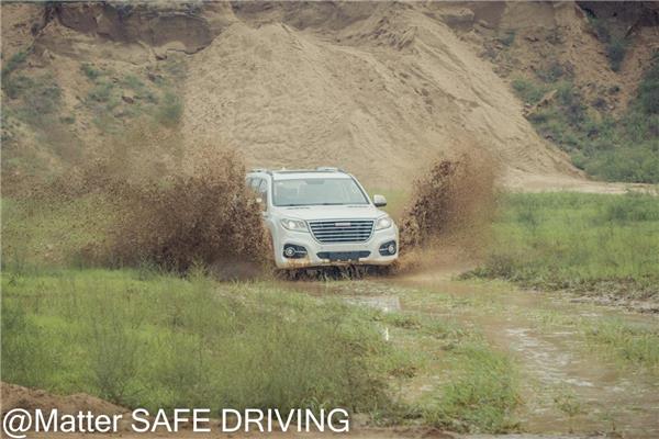 在场地的最里面,有一块沼泽地体验区。由于H9车身较高,即使在没有空气悬挂这样的配置情况下,控制好油门和方向,还是可以很轻松地通过这样的沼泽地。