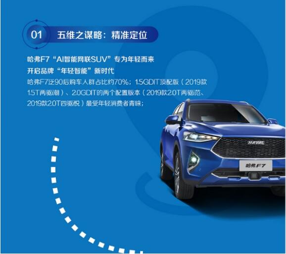 随着年轻人成为国内车市消费的主体,作为SUV领导者的哈弗多年前就在思考哈弗品牌的年轻化和智能化问题。2018年,哈弗推出F系,自发布以来围绕在其身上最重要的一个标签就是年轻化。而哈弗F7作为哈弗F系的旗舰车型,从产品设计到产品功能的研发,都很好地与年轻人达成了深层次的共鸣。