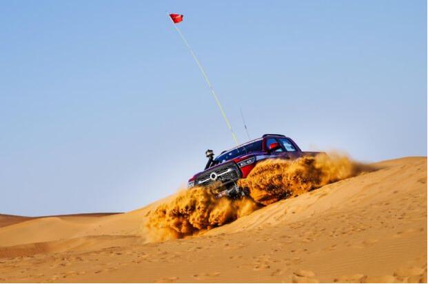 紧接着,车队进入另一条危机四伏的赛段——沙漠珠峰打卡。该路段隐藏了一个巨大的沙锅,对领航员的观察能力,车手的应变能力以及车辆的操控流畅度都是极大的考验。个别车队强行闯入巨大的沙锅,也就相当于直接宣布退赛了。