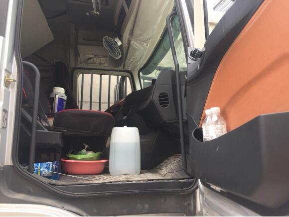 由于跑长途的需要,驾驶室内放着大桶水、洗漱用品等